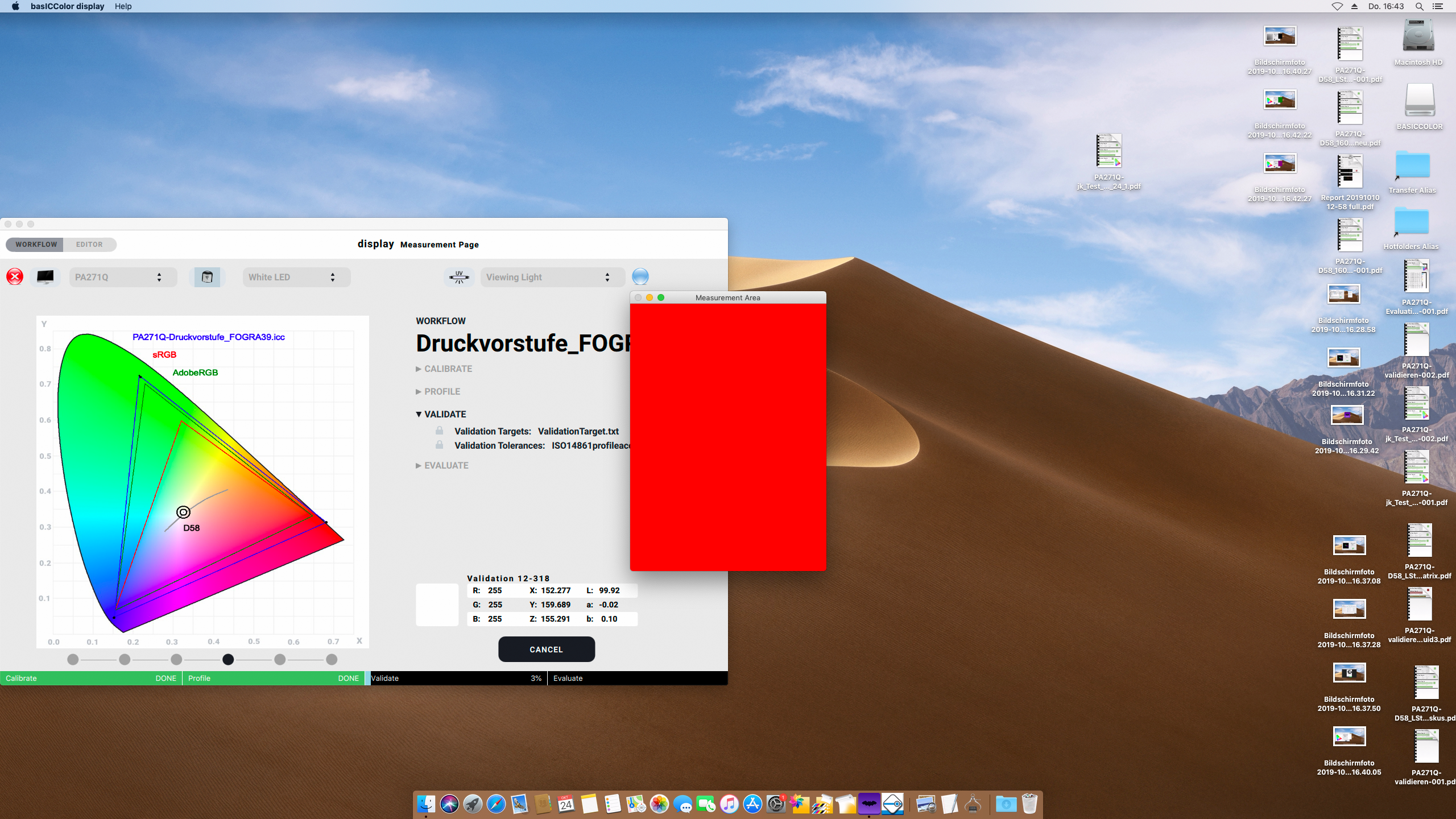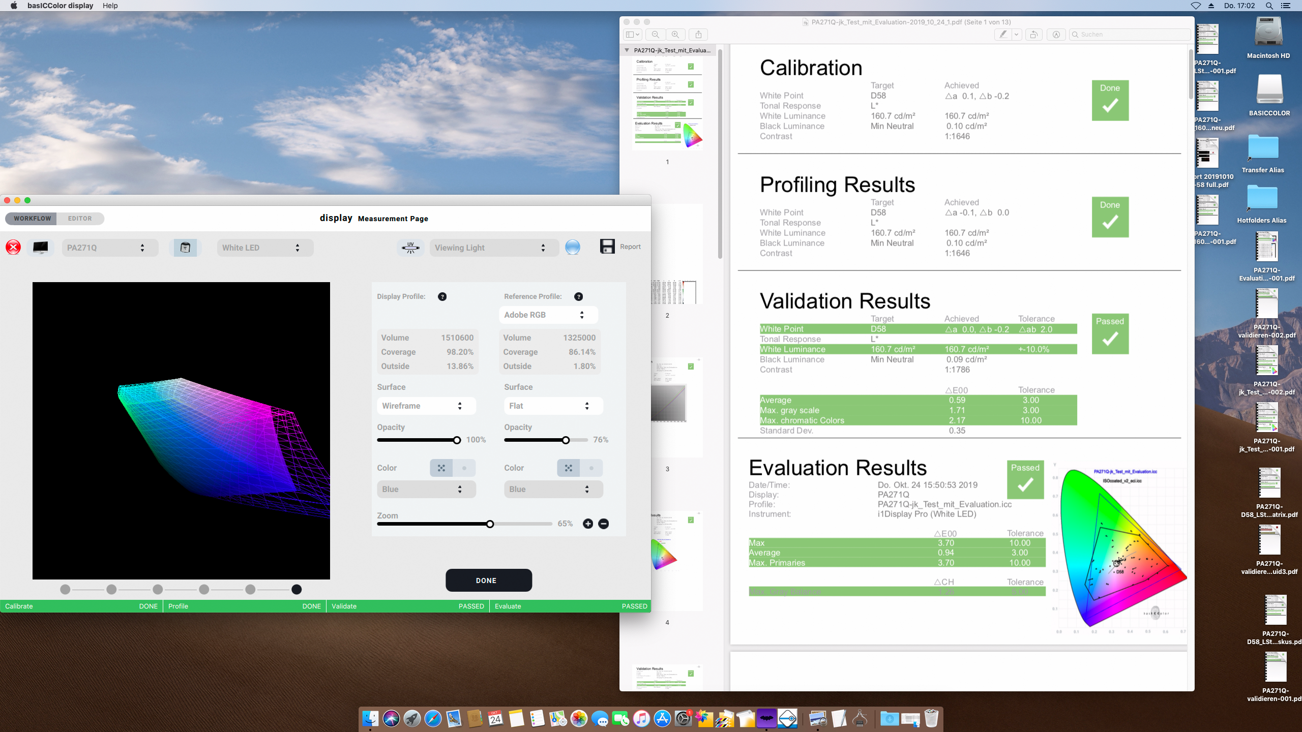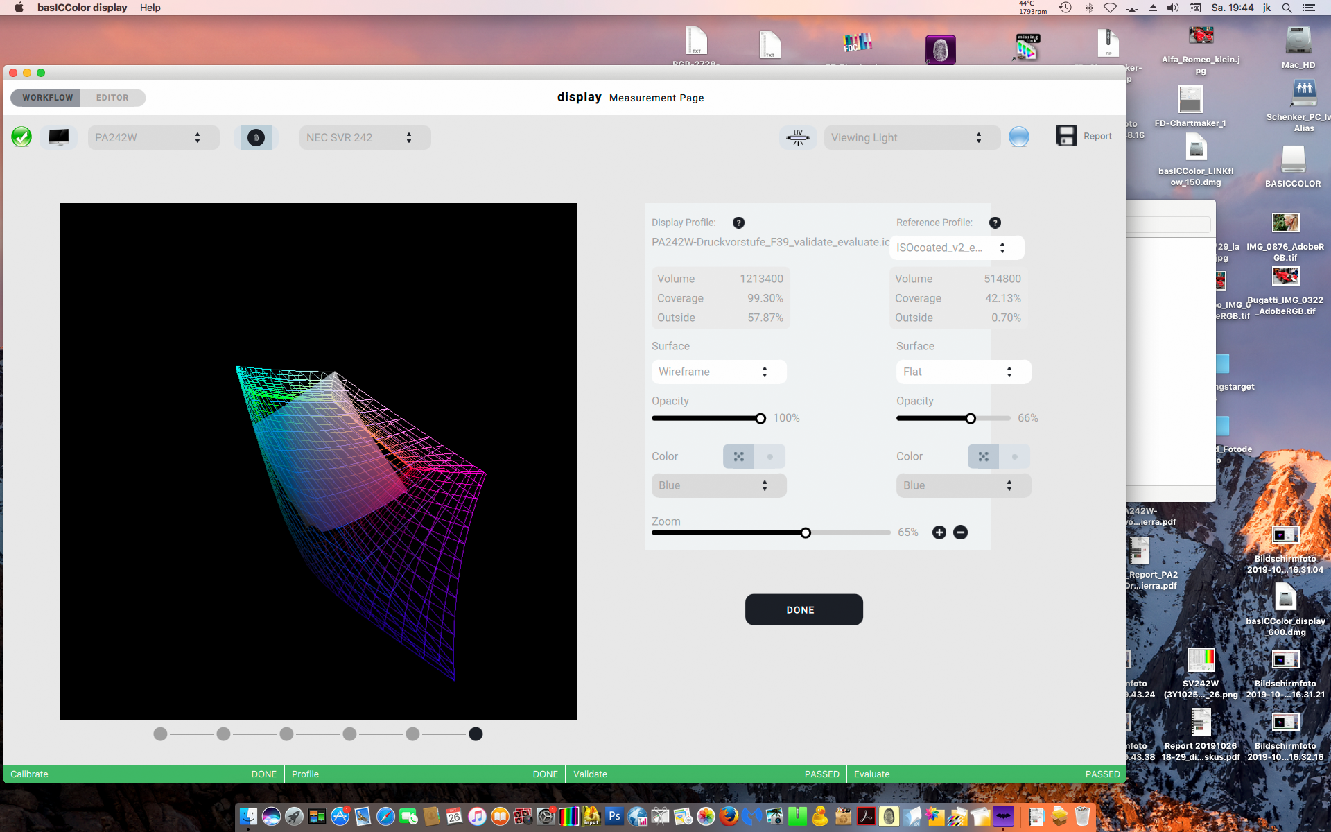 Nach jeder Kalibrierung wird der Monitor automatisch überprüft. Bei der Validierung wird überprüft, wie gut das aus den Meßwerten erstellte Profil und die Kalibrierung tatsächlich umgesetzt wird (Das entspricht der Überprüfung in display 5). Bei der Evaluation wird überprüft, ob ein gewählter Farbraum auf dem Monitor komplett und richtig dargestellt wird. Mit anderen Worten, es wird überprüft, wie gut mit dem aus den Meßwerten erstellte Profil und der Kalibrierung Daten in einem Referenzfarbraum dargestellt werden können. Die Evaluation für einen CMYK-Farbraum ist in display 6 Pro möglich.