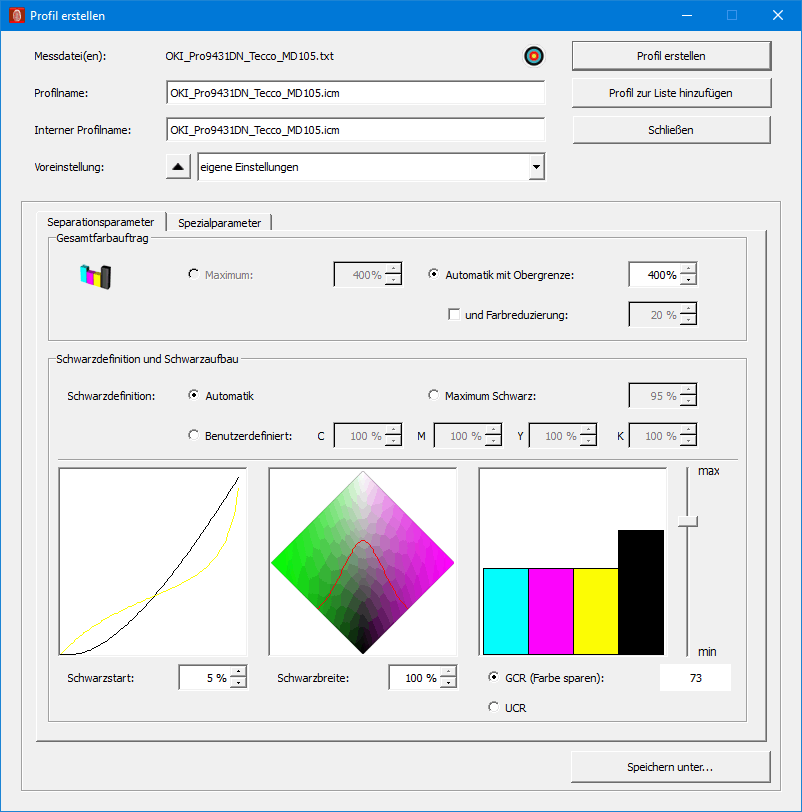 - Einfachste Bedienung durch Voreinstellungen und Drag-and-Drop - Batch- und Multi-Target-Profilierung - Integration von basICColor catch - Erstellt CMYK-, RGB- und Graustufenprofile - Erstellt wahlweise v2 oder v4 ICC-Profile - Erkennt wahlweise automatisch die richtige Kanalbegrenzung und den richtigen Gesamtfarbauftrag - Verschiedene Gamut-Mapping Strategien (Standard, Schwarzkompensation, Absolute Komprimierung, Minimale Komprimierung oder Gamut Mapping basierend auf einem Referenz-Profil) - Stufenlos einstellbare Gamut Kompression - Stufenlos einstellbare Korrektur für optische Aufheller - Legt die ICC-Profile automatisch entweder in den Systemordner oder in einen frei definierbaren Ordner (z.B. RIP) - Unterstützt alle Messdateien nach ISO-Standard