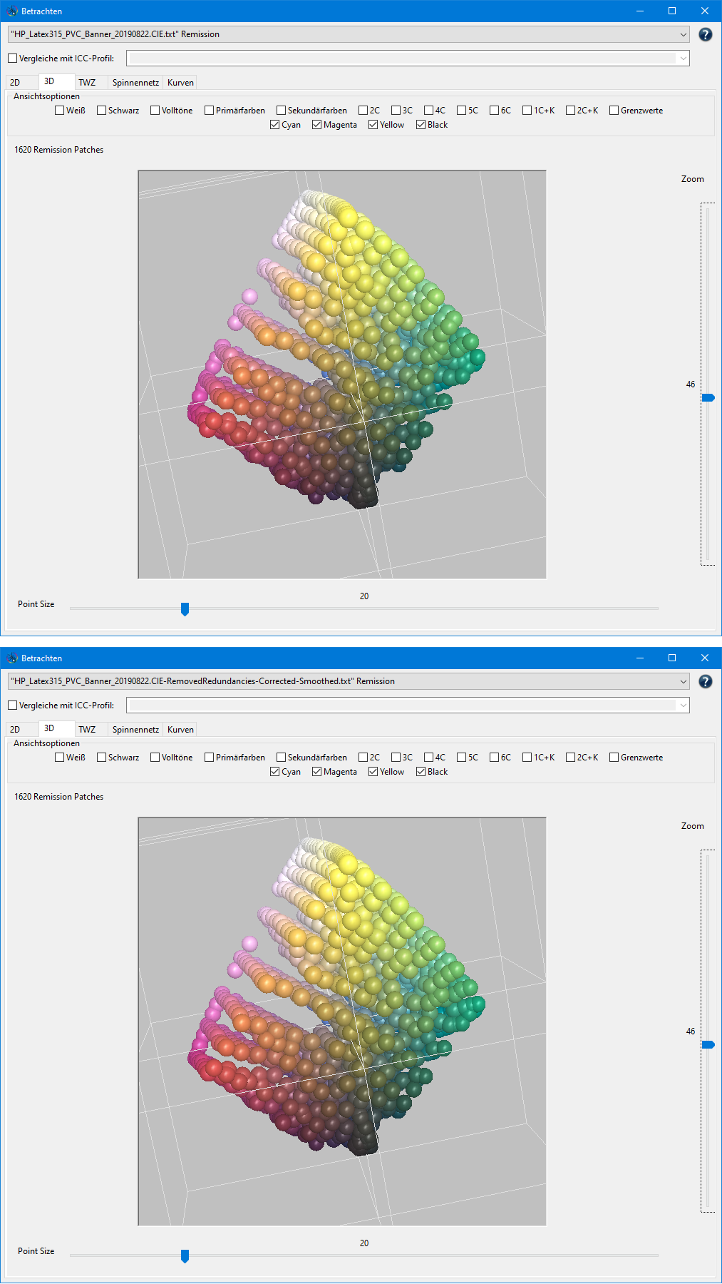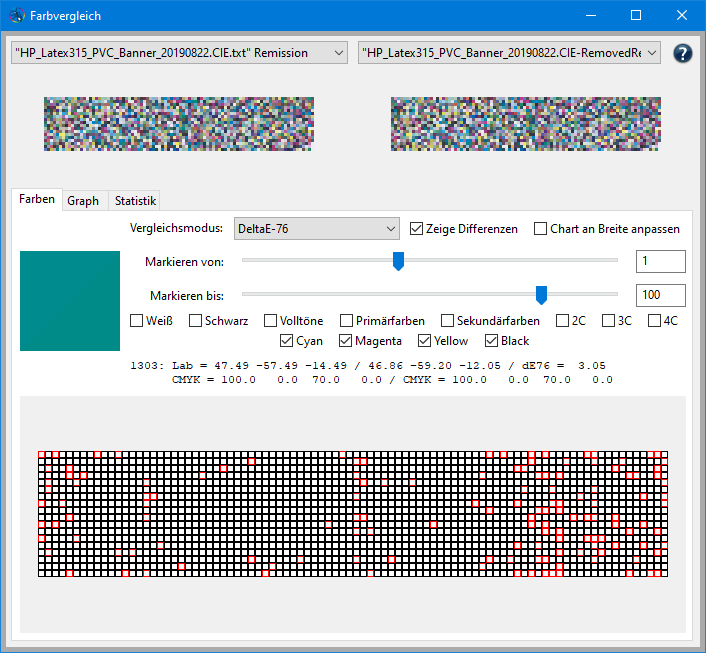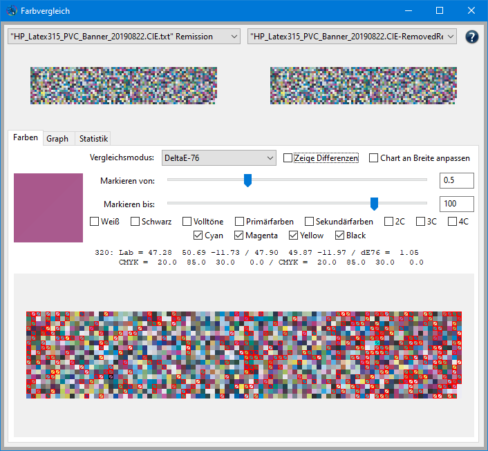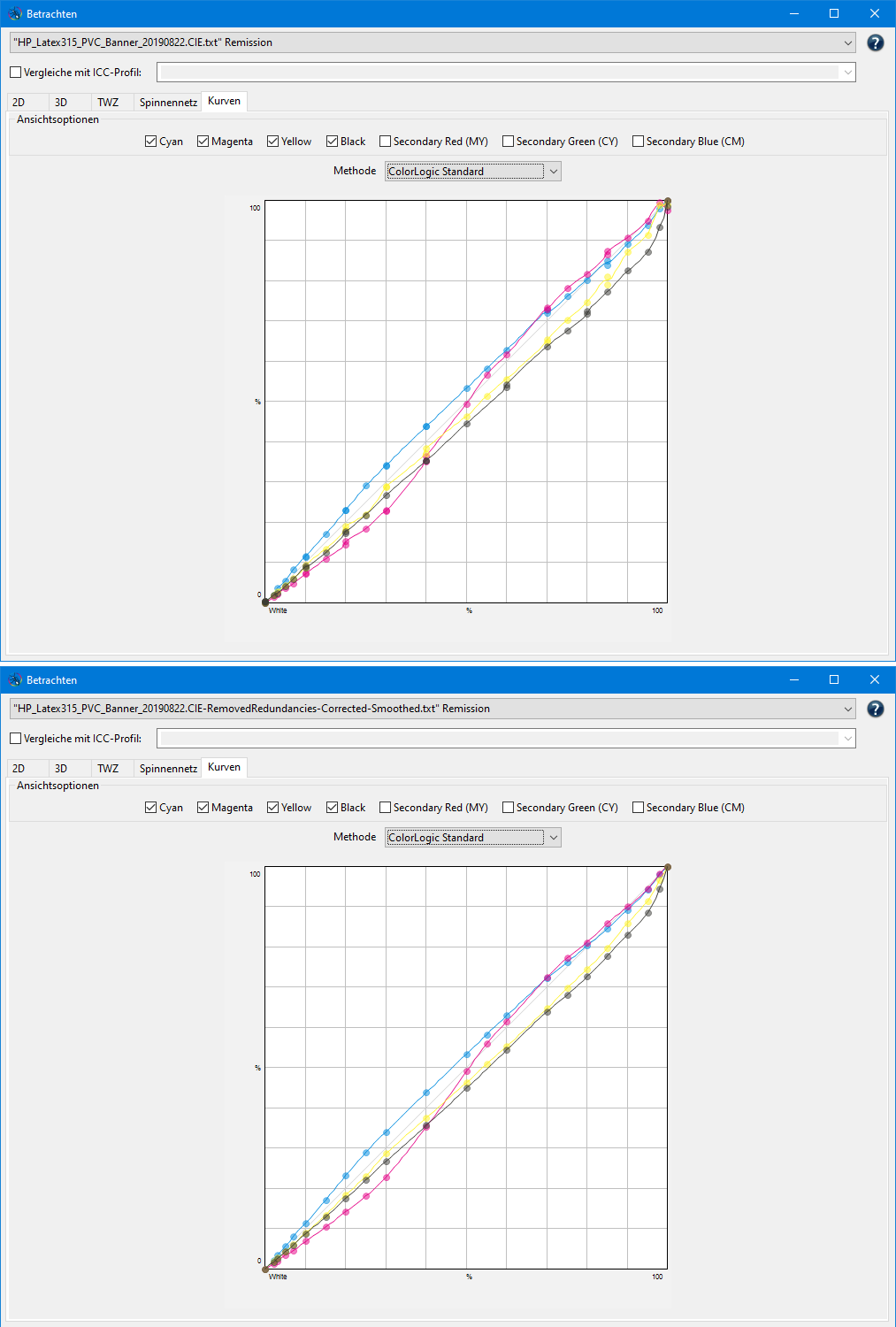 Für die Beispiele wurden orignale Meßdaten von der Profilierung eines eines Druckers HP Latex 315 auf PVC Banner verwendet.