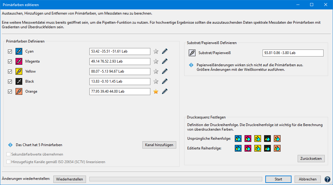 Das Werkzeug Primärfarben editieren (ab Version 3) ermöglicht es, virtuelle Messdaten zu erstellen, indem Sie aus den vorhanden Messdaten eines Testcharts, Primärfarben löschen oder verändern, das Papierweiß ändern oder auch Farbkanäle mit weiteren Primärfarben hinzufügen.