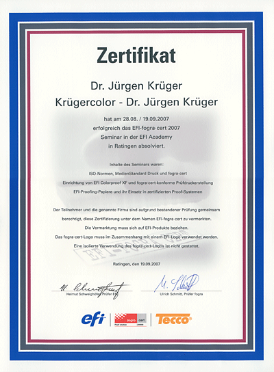 Dr. Jürgen Krüger hat von Anfang an - seit 1996, damals war Version 1.x von BESTColor aktuell - Wert auf umfassende Kompetenz und umfassendes Know How gelegt und dazu eine Vielzahl von Schulungen und Weiterbildungen absolviert und die erworbenen Kenntnisse an eigenen Proofsystemen angewendet und vertieft. Auf dieser Basis ist Krügercolor - Dr. Jürgen Krüger seit Gründung EFI Competence Partner. Als es die Möglichkeit gab, dieses Wissen und diese Kompetenz durch die FOGRA unabhängig zertifizieren zu lassen, habe ich die Möglichkeit genutzt und mich sofort zur “Prüfdruckzertifizierung mit Produkten von EFI und Papieren von TECCO” angemeldet und diese Prüfung am 19.09.2007 erfolgreich absolviert. Diese EFI-Fogra-DealerCert Zertifizierung ist zwei Jahre gültig. Deshalb habe ich mich sofort als der Termin von EFI und der FOGRA kommuniziert wurde, zur erneuten Zertifizierung “Prüfdruckzertifizierung mit Produkten von EFI und Papieren von TECCO” angemeldet und diese Prüfung am 01.12.2009 erfolgreich bestanden. Das Programm “EFI-FOGRA-Dealercert” wurde dann von der FOGRA nicht weitergeführt und ist in die Zertifizierung “FOGRA Digital Print Expert” aufgegangen. Das ehemalige EFI-FOGRA-Dealercert ist nun der kleine Teil “Contract Proof Creation” Am 14.06.2013 habe ich die Prüfungen zum Digital Print Expert erfolgreich bestanden.